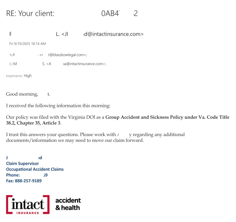 These policies are not first party motor vehicle insurance policies such as medpay in Virginia for pip in DC and Maryland. Instead they are an entirely separate kind of insurance policy that is governed by very unique laws. However, the insurance company (Uber, Affinity & Intact) will not tell you what law they are governed by. If you have a dedicated lawyer, however, you can flesh that out. Blaszkow Legal, PLLC has confirmed that, in Virginia, these policies are governed by Virginia Code Title 38.2, Chapter 35, Article 2, et seq (see the below email). You see, insurance policies in Virginia have to register what kind of policy they are, so you know what kind of law applies.